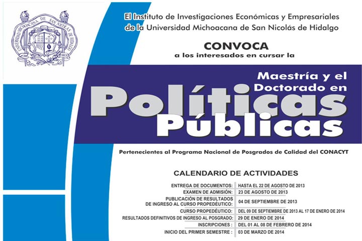 NOTICIAS 10/08/2013Opciones en postgrado en Maestría y DoctoradoEl instituto de Investigaciones Económicas y Empresariales de la Universidad Michoacana de San Nicolás de Hidalgo (ININEE), abre la convocatoria para egresados de licenciatura o maestría interesados en especializarse en los temas de Ciencias en Negocios Internacionales, doctorado; Políticas Públicas, maestría y doctorado; Ciencias de Desarrollo Regional, doctorado; y en Ciencias de Comercio Exterior, maestría.