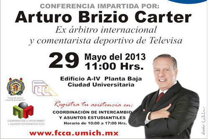 Arturo Brizio Carter, ex árbitro internacional mexicano de fútbol con gafete de la FIFA y comentarista deportivo de Televisa estará mañana en Morelia para impartir la conferencia Decisiones con Valor e interactuar con estudiantes de la Facultad de Contaduría y Ciencias Administrativas de la Universidad Michoacana de San Nicolás de Hidalgo.