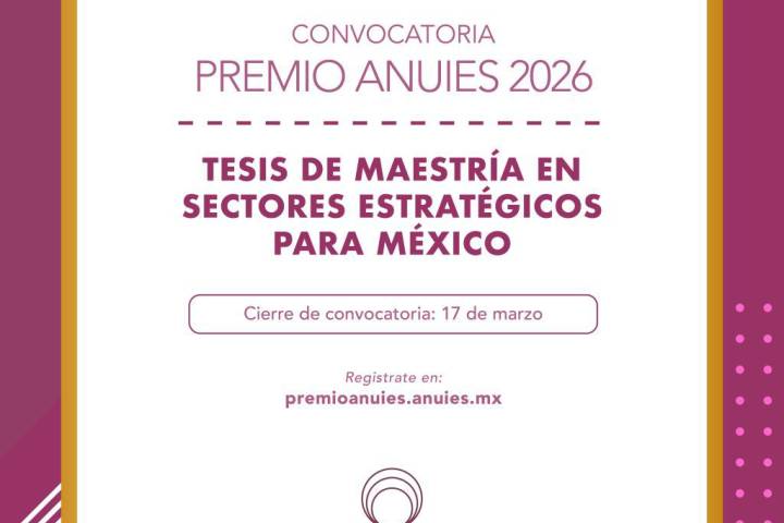 NOTICIAS 22/01/2026Abierta convocatoria para el Premio ANUIES 2026; UMSNH invita a egresados de posgrado a participarEgresados y egresadas de los programas de maestría y doctorado que ofrece la Universidad Michoacana de San Nicolás de Hidalgo (UMSNH), podrán postular su candidatura para el Premio ANUIES 2026 en las categorías de Tesis de maestría y doctorado en sectores estratégicos para México.